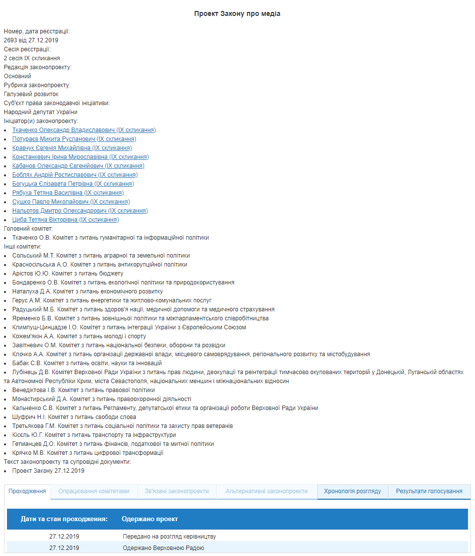 Вызвавший много споров и недовольства проект закона о медиа 27 декабря внесен в Верховную Раду и передан на рассмотрение руководству.