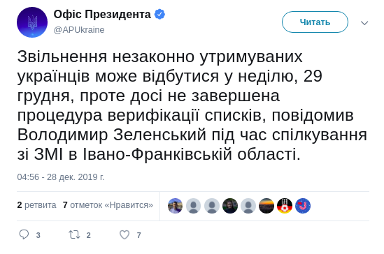 "Освобождение незаконно удерживаемых украинский может произойти в воскресенье, 29 декабря, однако до сих пор не завершена процедура верификации списков", - говорится в сообщении.