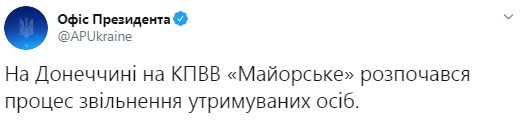 "На Донетчине на КПВВ "Майорское" начался процесс освобождения удерживаемых лиц" - сообщили в Twitter офиса президента.
