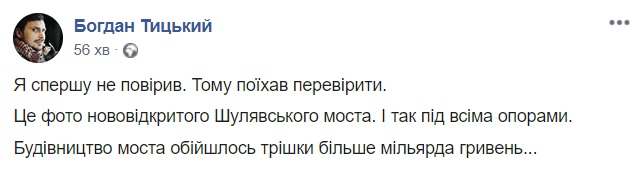 "Я сначала не поверил. Поэтому поехал проверить. Это фото новооткрытого Шулявского моста. И так во всем опорами. Строительство моста обошлось чуть больше миллиарда гривен...", -  написал Богдан Тицкий в Facebook.