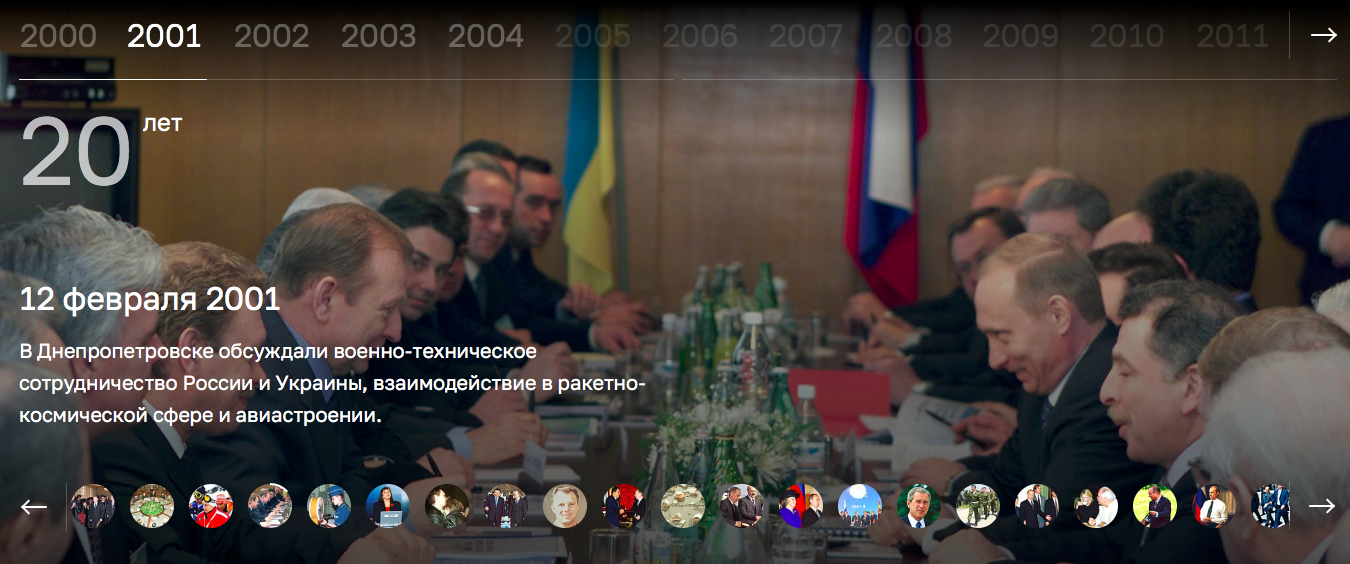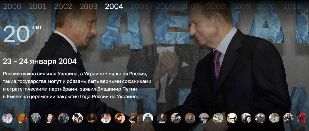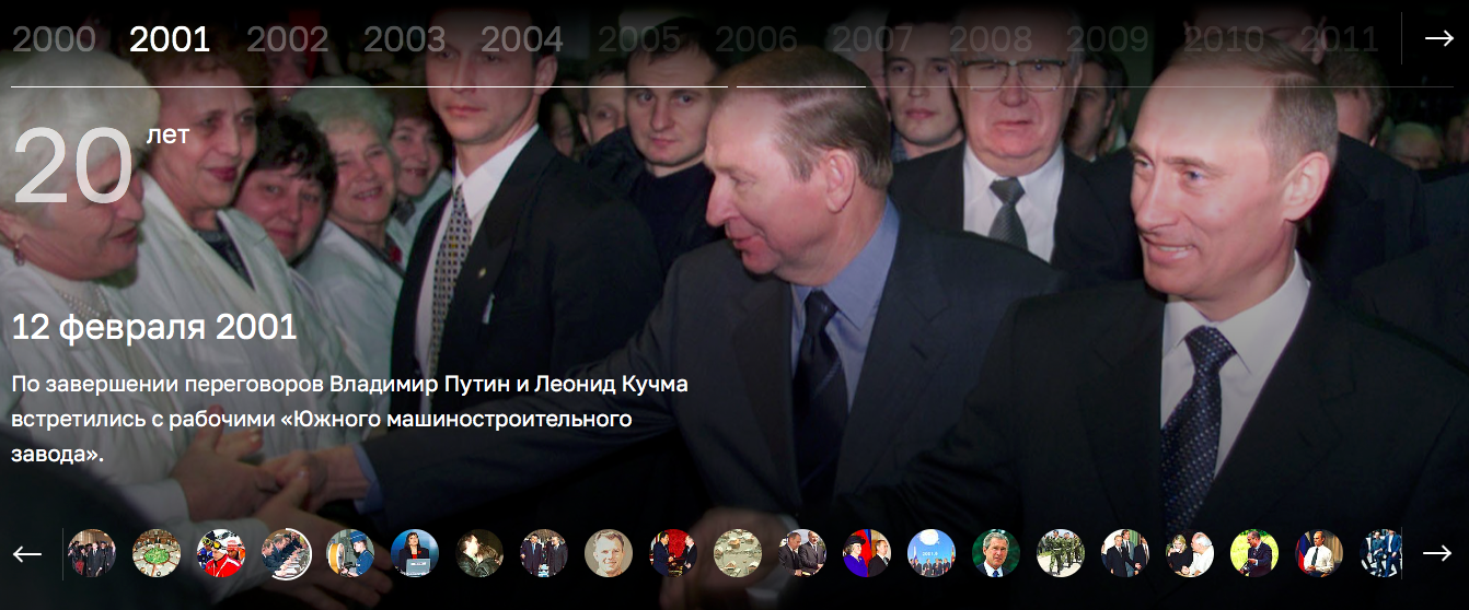 В опубликованном Кремлем фотоальбоме под названием "Путин.20 лет", приуроченном к 20-летию правления Путина, есть много фотографий с бывшим президентом Украины Леонидом Кучмой.