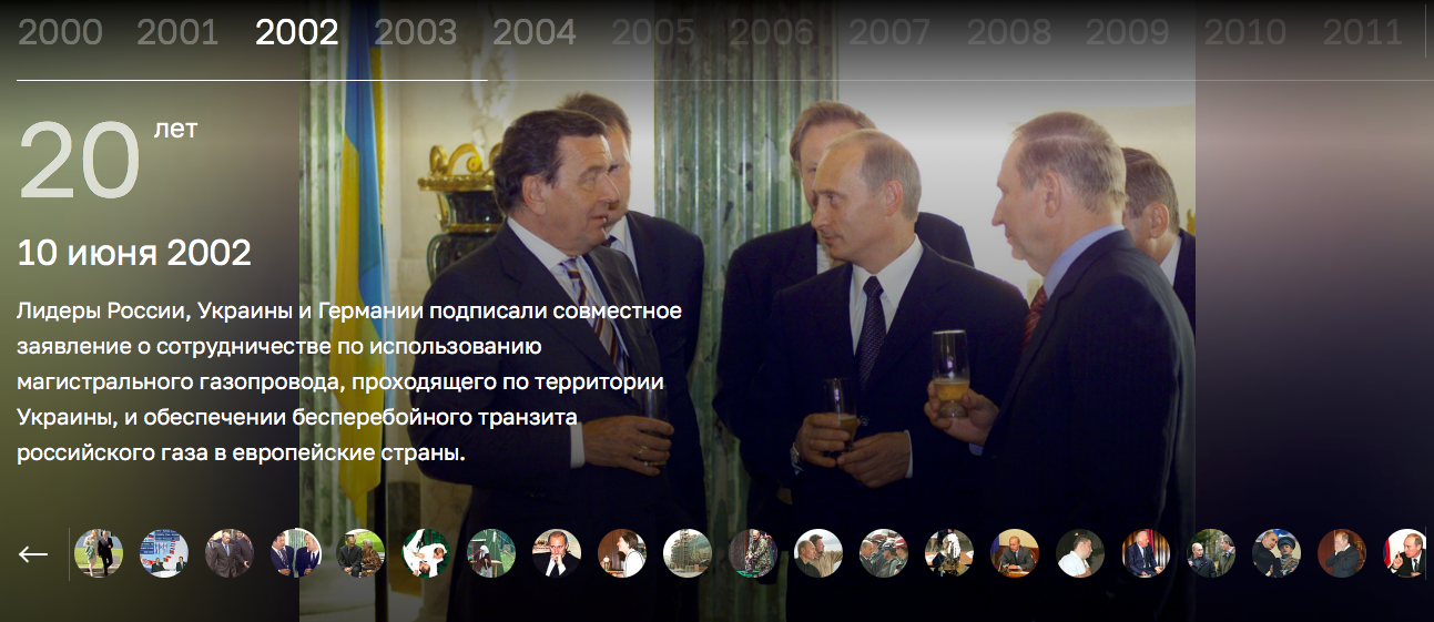 10 июня 2002: Лидеры России, Украины и Германии подписали совместное заявление о сотрудничестве по использованию магистрального газопровода, проходящего по территории Украины, и обеспечении бесперебойного транзита российского газа в европейские страны.