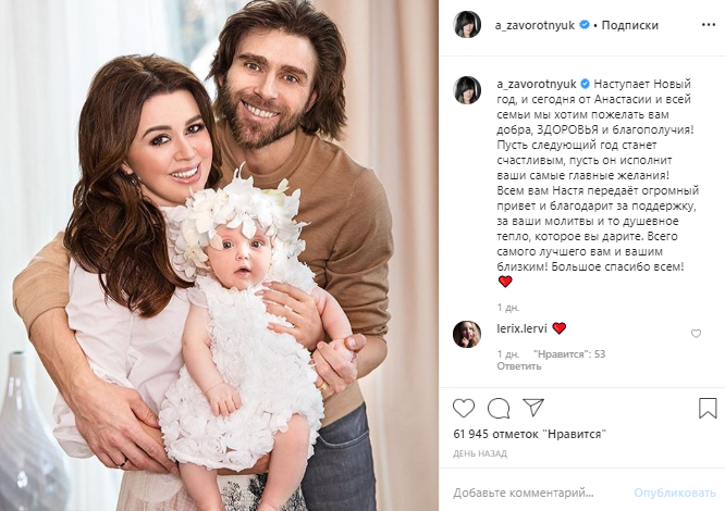 "Наступает новый год, и сегодня от Анастасии и всей семьи мы хотим пожелать вам добра, здоровья и благополучия! Пусть следующий год станет счастливым, пусть он исполнит ваши самые главные желания! Всем вам Настя передает огромный привет и благодарит за поддержку, за ваши молитвы и то душевное тепло, которое вы дарите. Всего самого лучшего вам и вашим близким! Большое спасибо всем!", - говорится в публикации.