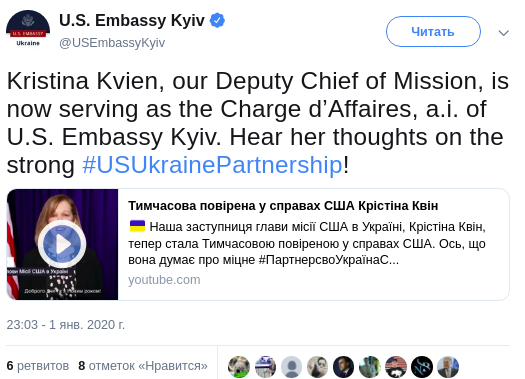 Временным поверенным в делах Соединенных Штатов Америки в Украине стала заместитель главы посольства США в Киеве Кристина Квин. Об этом пишет американское посольство в Twitter. Кроме того, они разместили на YouTube видео с обращением временного поверенного к Украине.