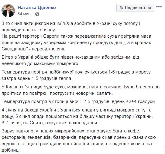 В пятницу 3 января существенные изменения маловероятны. "3-го января антициклон по имени Xia принесет в Украину сухую погоду и местами даже солнечную", - пишет Диденко. В Киеве в пятницу будет сухо и, может быть, солнечно. Ночью в столице -2...-5 градусов, днем +2...+4.