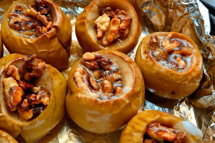 11. Запеченные яблоки - еще одно блюдо на десерт. Половинки яблок с вынутой сердцевиной запекают в духовке, наполнив их орехами и медом. Готовые посыпают корицей. Запекать лучше на фольге, чтобы они не пристали к противню.
