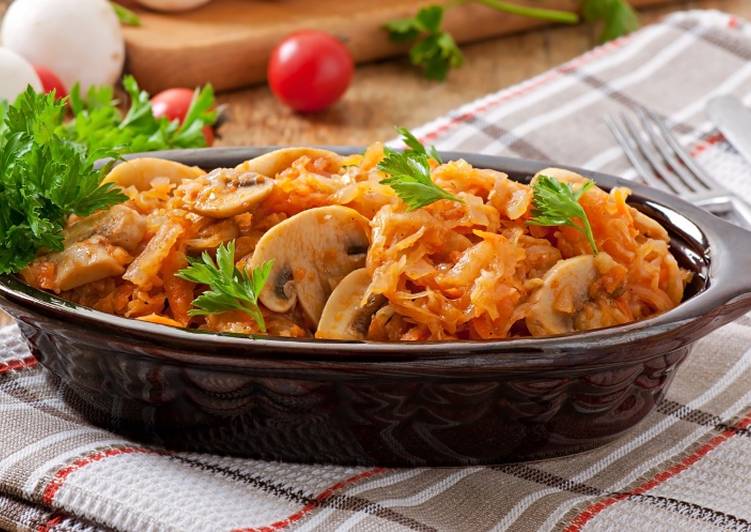 6. Тушенная капуста с грибами. Сытное и вкусное постное блюдо - тушенная капуста с грибами, луком и морковью. Для аромата в конце готовки можно добавить лавровый лист, посыпать молотым кориандром.