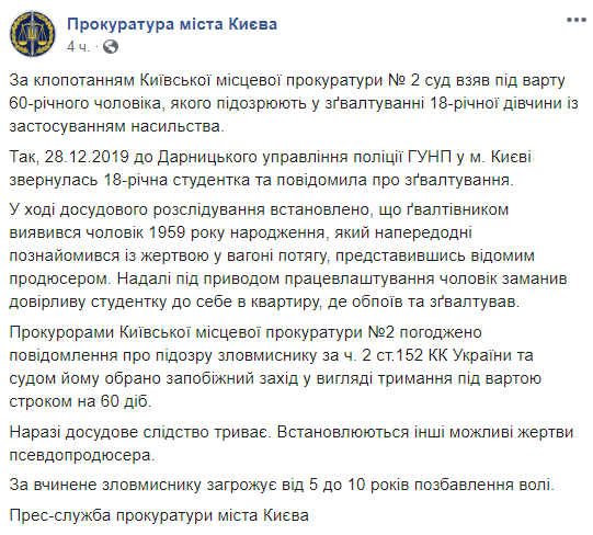 Девушка заявила об изнасиловании 28 декабря в Дарницкое управление полиции Киева. В ходе досудебного расследования установлено, что насильником оказался мужчина 1959 года рождения. Он познакомился с жертвой в вагоне поезда, представившись известным продюсером. В дальнейшем под предлогом трудоустройства человек заманил доверчивого студентку к себе в квартиру, где опоил и изнасиловал.