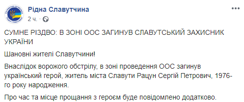 "В результате вражеского обстрела, в зоне проведения ООС погиб украинский герой, житель города Славуты Рацун Сергей Петрович, 1976 года рождения", - говорится в сообщении.