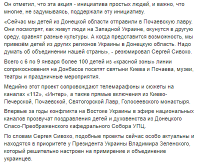 "Мы сейчас работаем над платформой национального примирения и единства. Одна из ключевых программ в ней - программа "быстрых шагов". Это то, что мы можем сделать прямо сейчас, в том числе, по отношению к детям. Ведь на Донбассе уже выросло целое поколение, которое кроме войны ничего не видело. Давайте подарим им настоящий праздник! Это же здорово и в духе Рождества!", - сказал Сивохо.
