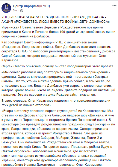 Напомним, что УПЦ в Рождественские праздники принимает в Киеве и Почаеве более 100 детей из "красной зоны" линии соприкосновения на Донбассе.