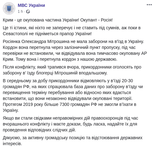 Россиянке Александре Митрошиной не был запрещен въезд в Украину. Границу она пересекла через железнодорожный пункт пропуска, во время проверки не установили, посещала ли она временно оккупированную АР Крым. Поэтому она и пересекла границу с нашим государством.