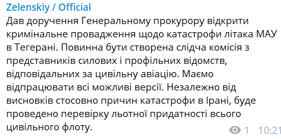 10:22 Зеленский дал указание открыть дело по факту авиакатастрофы в Иране и создать межведомственную следственную группу. И проверить весь летный состав гражданского флота.