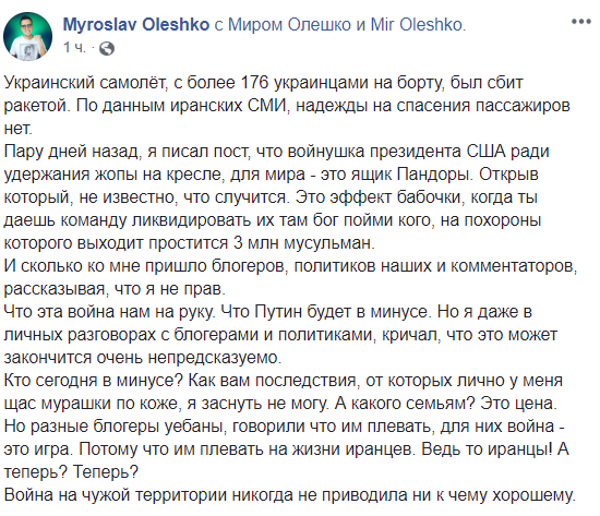 "Ужасная история с падением Boeing 737-800, особенно учитывая параллельный ракетный обстрел Ираном военной базы в США и закрытие американцами воздушного пространства над Ираном и Ираком, выглядит подозрительно", -пишет Арьев.