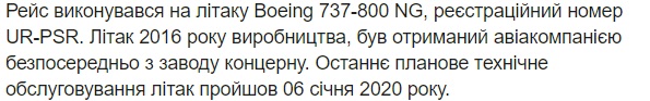 "Рейс выполнялся на самолете Boeing 737-800 NG, регистрационный номер UR-PSR. Самолет 2016 года производства, был получен авиакомпанией напрямую с завода концерна. Последнее плановое техническое обслуживание самолет прошел 6 января 2020", - говорится в сообщении.