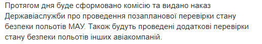 Премьер-министр Украины Алексей Гончарук заявил о создании комиссии, которая займется внеплановой проверкой состояния безопасности полетов в МАУ и других авиакомпаниях. Об этом он сообщил на своей странице в Facebook.