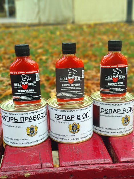 Судя по всему в ассортименте есть и соусы под названием "Hell Daddy" в вариантах "Смерть врагам" и "Пылающая задница".