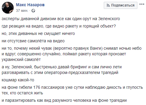 "Зеленский при всех искушениях сделал единственно правильное заявление по поводу самолета, хотя и шел к нему очень долго. Он не стал "задрав штаны, бежать за Вашингтоном" (не поддержал позицию США и его партнеров в конфликте с Ираном) и попросил большего количества доказательств. Как ни странно, это первый, хотя и маленький, шаг к субъектности Украины. Без традиционного "Немец скажет: вы - монголы". На этот раз "Дональд скажет:" Это ракеты" - Ракеты! Ракеты! Вместо доказательств воспринимают CNN сюжеты", - счита