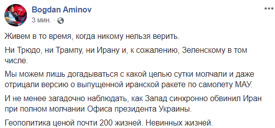 "Зачем Зеленский сказал, что Трамп лжец? Сегодня команда Зе и те, кто рядом, завели новую шарманку: не говорить ничего о сбитом ракетой самолет - это мудро. Лучше выражение, я слышал по этому поводу - надо набраться терпения. Еще мне очень нравится аргумент, что Трюдо имел право что-то говорить, потому что там погибли канадцы. Но это так, пипл может и схавает.