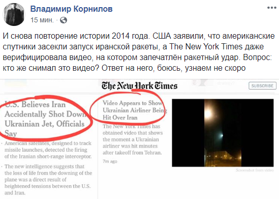 23:02  "И снова повторение истории 2014 года. США заявили, что американские спутники засекли запуск иранской ракеты, а The New York Times даже верифицировала видео, на котором запечатлён ракетный удар. Вопрос: кто же снимал это видео? Ответ на него, боюсь, узнаем не скоро", - пишет политолог Владимир Корнилов.
