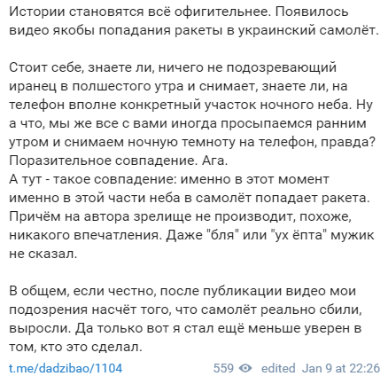 Главное не это. Главное то, что мы не просто молчим - мы молчим вместе с Ираном и Россией. И в своем заявлении Зеленским прямым текстом говорит: я не верю Трампу, Трюдо и Джонсону. Есть еще один момент - Зеленский просит предоставить все доказательства, что ракета была сбита. Но это еще вчера должны были делать ГУР и СБУ. И сегодня мы уже должны были иметь подтверждения.