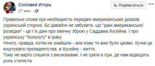 Правильные слова о необходимости передачи американских доказательств украинской стороне. Потому давайте не забывать, что "данные американской разведки" - это и их данные о химическом оружии у Саддама Хусейна. И об украинской "Кольчуге" в Ираке. Ничего, правда, потом не нашли - но кому это уже было интересно. Кучме это стоило президентства, а Хусейну - жизнь. Поэтому не стоит спешить с выводами. И не играть в игры, где нам отводят роль статиста.