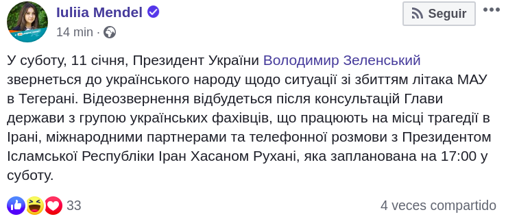 В субботу, 11 января, президент Украины Владимир Зеленский обратится к украинскому народу по поводу того, что самолет МАУ сбили военные Ирана в Тегеране. Об этом сообщила пресс-секретарь президента Юлия Мендель.