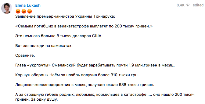 Сегодня вечером, 11 января, премьер-министр Украины Алексей Гончарук озвучил размер выплат от Кабмина семьям украинцев, погибших в авиакатастрофе в Иране