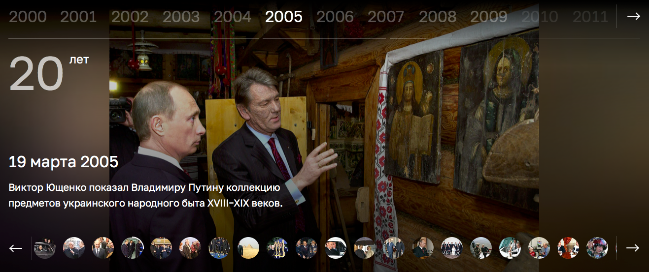 Первая порция кадров - с 2000 по 2005 год - появилась накануне Нового года. В этот период времени у президента России было много встреч с тогдашним украинским лидером Леонидом Кучмой. Вместе они несколько раз посещали Крым, гуляли там и пили вино, праздновали общие дни рождения, посещали рыбалку.