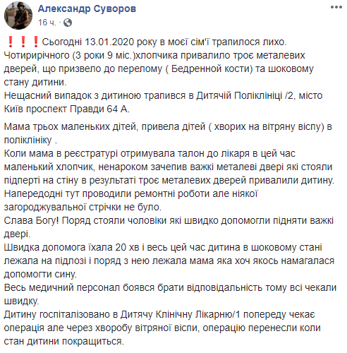 В Киеве на 4-летнего мальчика рухнули тяжелые металлические двери, которые находились в коридоре рядом с регистратурой детской поликлиники № 2 по проспекту Правды 64 А. Ребенок пришел в больницу вместе с мамой 13 января из-за ветрянки. Родные малыша просят помощи у очевидцев случившегося и всех неравнодушных людей, поскольку мальчику предстоит сложная операция по восстановлению тазобедренной кости. О случившемся сообщил Александр Суворов на своей странице в Facebook.