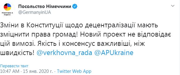 "Изменения в Конституции по децентрализации должны укрепить права общин! Новый проект не соответствует этому требованию. Качество и консенсус важнее, чем скорость!", - заявили в посольстве.