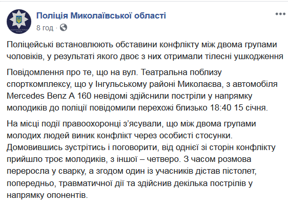 ЧП произошло около 18.40 на ул. Театральная вблизи спорткомплекса в Ингульском районе Николаева. Здесь из автомобиля Mercedes Benz A 160 неизвестные открыли огонь по своим оппонентам и скрылись, как передает пресс-служба областного управления ГУНП в своем Facebook.