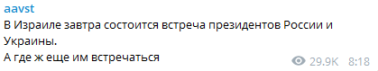 Об этом сообщил главный редактор издания "Эхо Москвы" Алексей Венедиктов в своем телеграм-канале. "В Израиле завтра состоится встреча президентов России и Украины. А где же еще им встречаться", - написал Алексей Венедиктов.