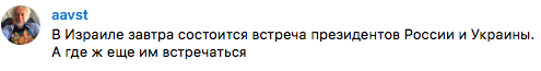 "В Израиле завтра состоится встреча президентов России и Украины. А где ж еще им встречаться", - написал журналист.