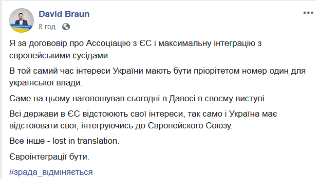 Все остальное - lost in translation (потеряно при переводе - Ред). Евроинтеграции быть", - написал Давид Арахамия и поставил хэштег #зрада_відміняється.