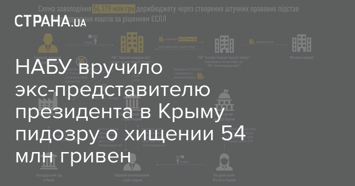 Детективы Национального антикоррупционного бюро (НАБУ) сообщили о подозрении в хищении 54,179 млн грн из бюджета бывшему украинскому представителю президента в Крыму, бывшему уполномоченному по делам Европейского суда по правам человека (ЕСПЧ) Борису Бабину; экс-первому замминистра юстиции; бенефициару частной компании и трем лицам, приближенным к одному из бывших депутатов Верховной Рады.