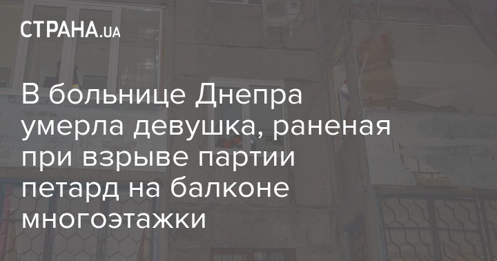 В Днепре скончалась 17-летняя девушка, которая 21 января пострадала при взрыве петард на балконе одной из жилых многоэтажек левого берега города. Пострадавшую госпитализировали в бессознательном состоянии с тяжелой черепно-мозговой травмой. За ее жизнь боролись врачи Днепровской областной больницы им. Мечникова. О смерти девушки на своей странице в соцсети сообщил заместитель главного врача медучреждения Александр Толубаев.