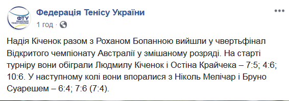 Надежда Киченок в миксте вышла в 1/4 турнира серии Большой шлем. Фото: facebook.com/UkrainianTennisFederation
