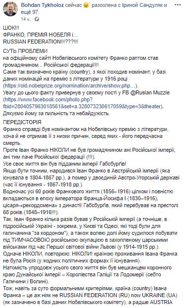 На сайте Нобелевского комитета писателю Ивана Франко записали в российские писатели. Это заметили в сети. Об этом в Facebook написал пользователь Ruslan Muzzle, а также директор музея Франко во Львове Богдан Тихолоз. В музее Франко возмутились, что нужно было указать, что он жил в Австрии.