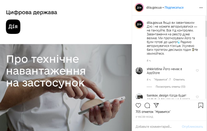 В "Дії" уже сообщили о технических нагрузках на приложение в первый день скачивания и призвали пользователей не паниковать и попробовать авторизацию позже.