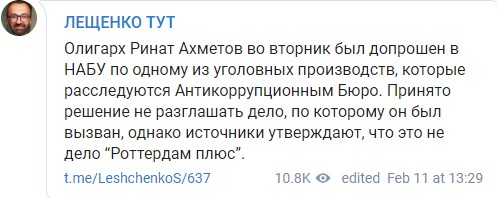 В свою очередь, Сергей Лещенко написал о том, что Ахметова допросили в НАБУ по одному из уголовных дел, которые расследуются Бюро.