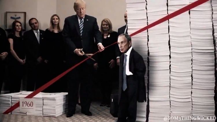 Ко второму сообщению Трамп прикрепил публикацию директора по медиа Белого дома Дэна Скавино с картинкой. На коллаже изображен перерезающий красную ленточку Трамп и Блумберг вдвое ниже ростом.