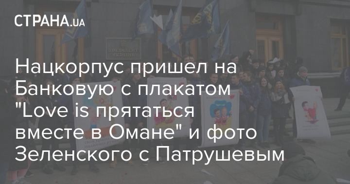 Нацкорпус пришел на Банковую с плакатом "Love is прятаться вместе в Омане" и фото Зеленского с Патрушевым