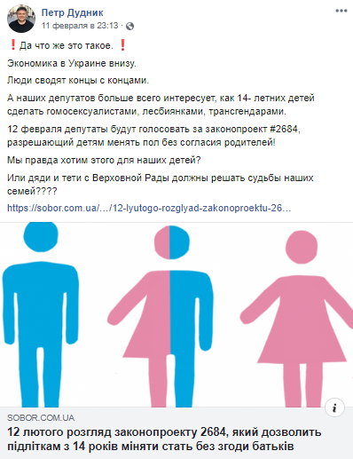 12 февраля депутаты будут голосовать за законопроект #2684, разрешающий детям менять пол без согласия родителей! Мы правда хотим этого для наших детей? Или дяди и тети с Верховной Рады должны решать судьбы наших семей????" - ореагировал пастор-волонтер Петр Дудник.