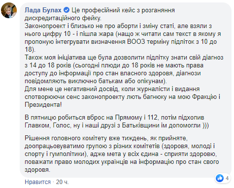 "Конечно, это ложь! Просто качественный вброс дескридитации моей фракции и меня лично перед местными выборами. Законопроект я еще перед новым годом зарегистрировала и он вовсе не об изменении пола, а о возможности людям получать медицинскую помощь с 14 лет. Ведь чтобы получить медуслуги надо выбрать семейного врача и подписать декларацию.