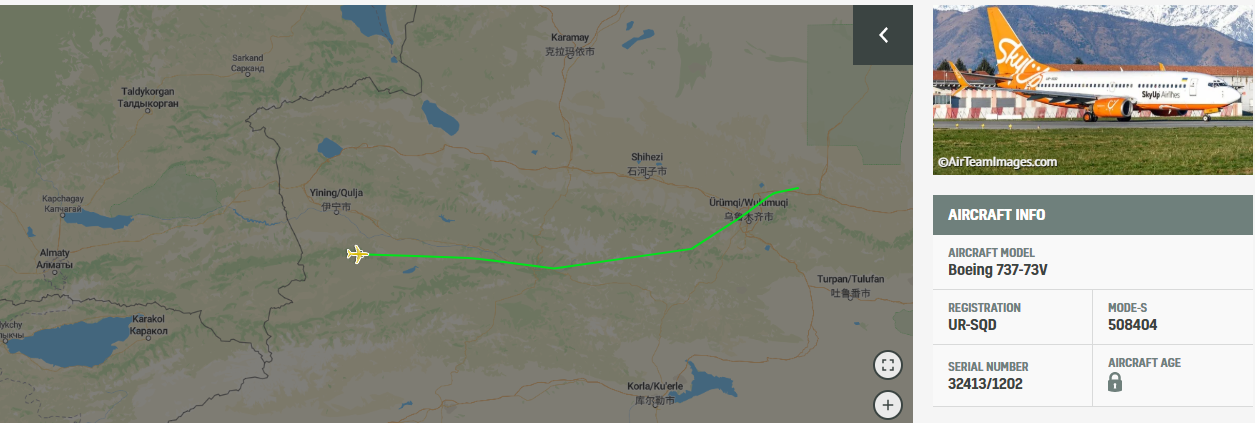 12:30 Борт вылетел из Алматы и пролетает над территорией Китая. То есть он преодолел примерно половину пути.