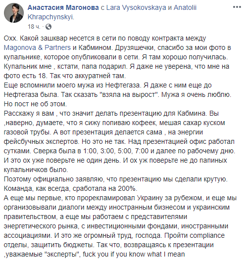 "Охх. Какой зашквар несется в сети по поводу контракта между Magonova & Partners и Кабмином. Друзяшечки, спасибо за мои фото в купальнике, которое опубликовали в сети. Я там хорошо получилась. Купальник мне, кстати, папа подарил. Я даже не уверена, что мне на фото есть 18. Так что аккуратней там.