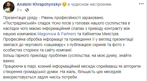 Директор по развитию в "Magonova & Partners" Анатолий Храпчинский написал, что профессиональная обработка информации и приведение ее в вид презентации свелась к очередному "зашквару" с публикацией скринов и фото с личных страниц и сайта компании. То есть компания не просто подготовила слайды по готовым отчетам, но и обрабатывала информацию из министерств.