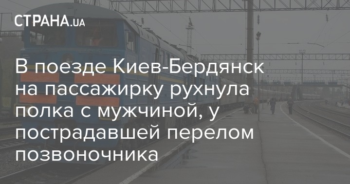 Перелом грудного отдела позвоночника получила пассажирка поезда "Киев-Бердянск" после того, как на нее рухнула верхняя полка, на которой спал мужчина. Об этом сообщает издание "Районка"