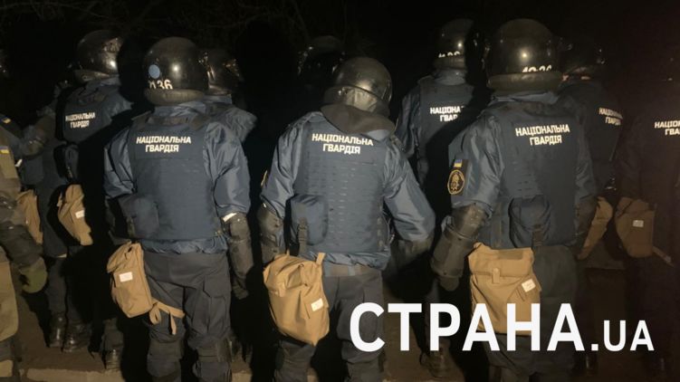В Новые Санжары уже въезжают автобусы с украинцами из Уханя. Они едут вдоль рядов Нацгвардии под крики местных жителей.